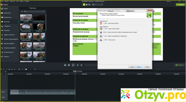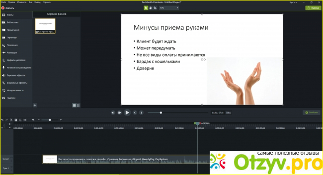 - Добавление аудио эффектов, выносок, эффектов курсора и переходов