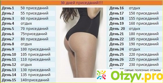 И последние приседания, главное делать правильно, иначе колени Вам не скажут спасибо. Важно, чтобы колени при приседе не выступали за носки, вес тела направляем на пятки.