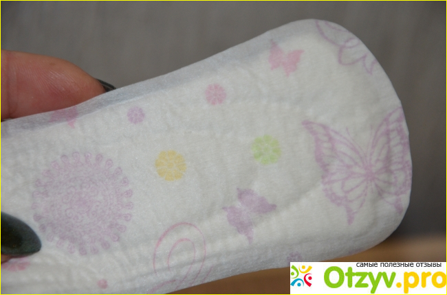 Сами прокладки не привычного однотонного белого цвета, на них есть бледные разноцветные рисунки.