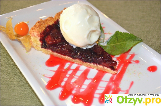 5. Готовому пирогу даём остыть, после чего вынимаем его из формы (иначе не вынется). Сверху каждый кусочек при подаче можно украсить шариком мороженного. Приятного аппетита. Внизу реальное фото готового кусочка пирога из ресторана.