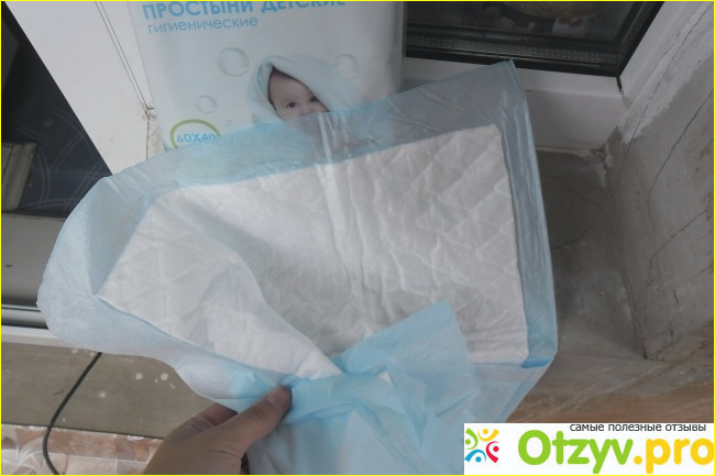 По виду эта простынь такая же, как и у других производителей. Слой полиэтилена тонкого, он голубого цвета, находится снизу простыни, предотвращает протекание влаги на диваны, кровати. Причем реально не протекает, а сам полиэтилен прочный довольно-таки, ни одна такая простынь у нас не порвалась.