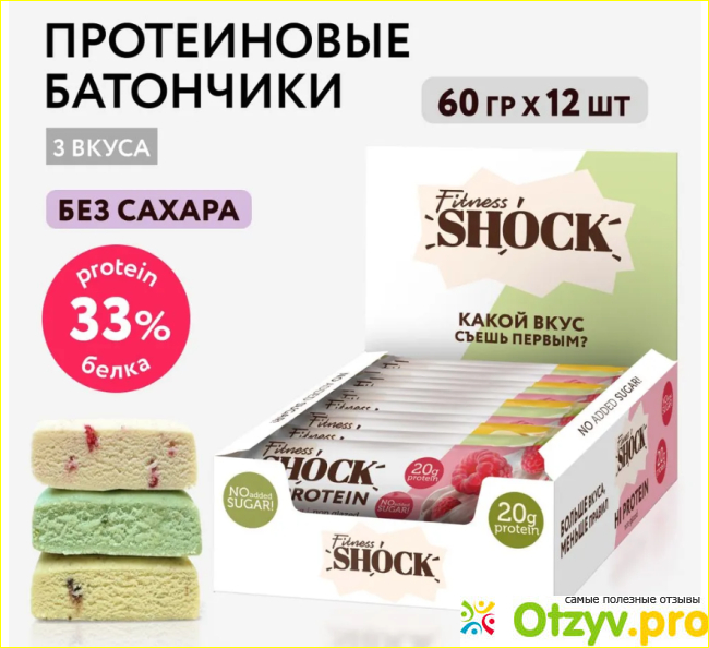 Поэтому не оставляю без внимания полезные и вкусные вариантов перекуса. Эти батончики Фитнес Шок идеально подходят. Главное достоинство этих батончиков - натуральный состав без сахара и пшеничной муки. Каждый батончик богат белком, а вот углеводов и жиров мало в них. Отдельного внимания заслуживает текстура батончиков. Они достаточно плотные, но при этом мягкие, не тяжело жуются. Так же батончики не крошатся, не тают, их можно взять с собой куда угодно: в спортзал, на работу или в путешествие. Батончики не покрыты глазурью. Много места в сумке не занимают, ношу с собой, всегда под рукой, когда понадобится перекусить. Отлично утоляют чувство голода, и если хочется вкусняшку, лучше съесть батончик ведь он очень вкусный, но без сахара. Эти протеиновые батончики можно с уверенностью рекомендовать всем, кто ценит качество, удобство и вкус.