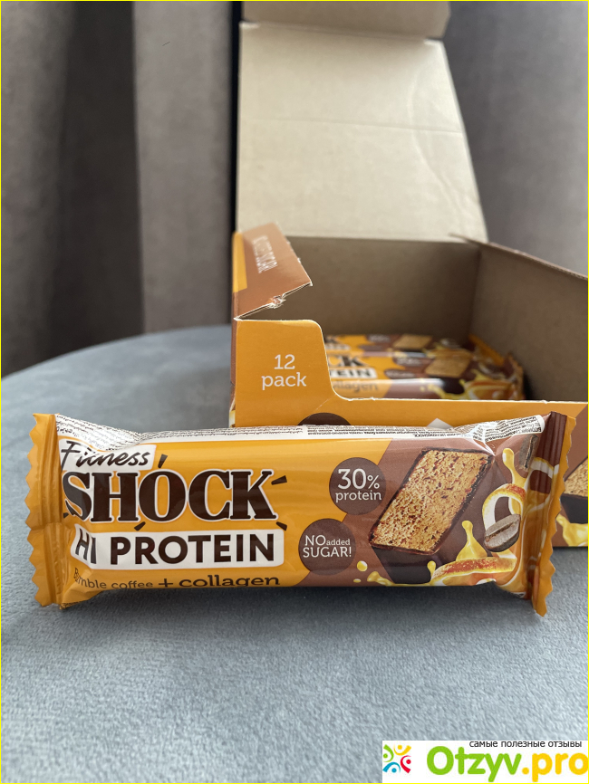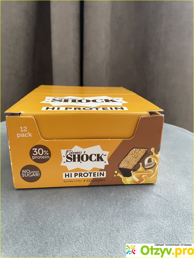 Моя подруга подсказала мне покупать полезные сладости, т. е. специальные батончики, печенья и т. д. без сахара и муки. Она мне посоветовала Fitness Shock. Я нашла продукцию этого бренда в интернет-магазине и заказала упаковку протеиновых батончиков Бамбл кофе Hi Protein.