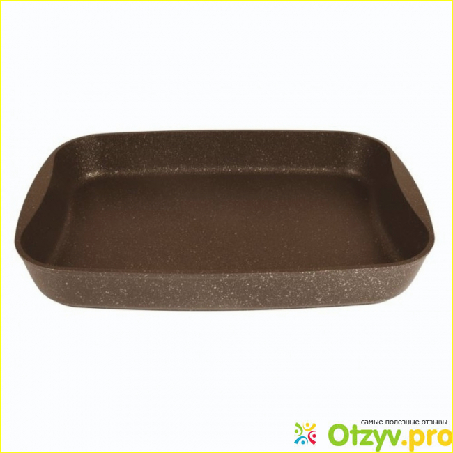 Внешне противень выглядит солидно, даже красиво: его антипригарное покрытие напоминает покрытие под мрамор, он как будто изготовлен из цельного куска камня. Бортики высокие, поэтому в нём можно запекать блюда из полужидкого и даже жидкого теста. Расход масла минимальный, поскольку антипригарное покрытие очень качественное, а дно толстое. В аннотации указана толщина металла на дне – 6 мм. Производитель рекомендует пользоваться противнем без добавления масла, поскольку изделие обладает высокой теплопроводностью и эргономичностью.
