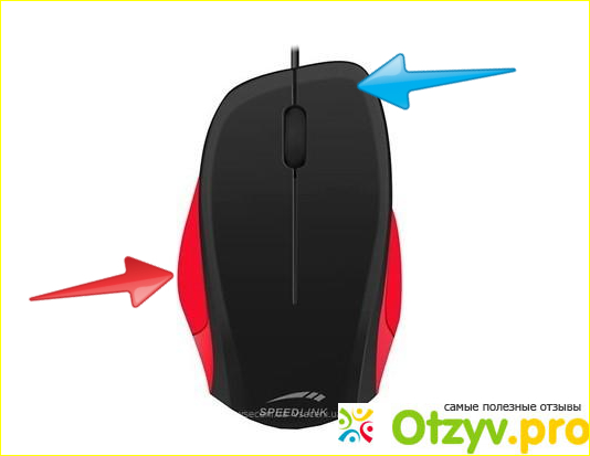 Эта мышка мне понравилась своим дизайном, стильная не симметричная, не похожая на другие. В описании говорится, что мышка для правшей. Поэтому, наверное, она такой формы. Где синяя стрелочка, должен средний палец удобно располагаться, много места ему выделено. Красная стрелка указывает на выступ, на который обопрется большой палец.
