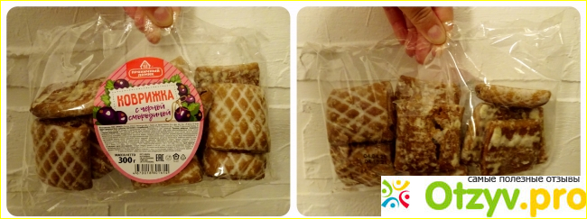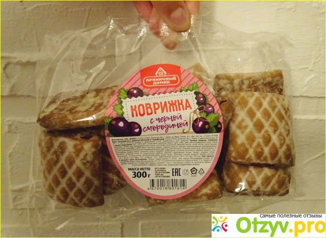 На этикетке изображены сочные ягоды чёрной смородины, а в нижней части очень мелким шрифтом напечатана вся информация о продукте. Вес товара 300 граммов, стоимость - 50 рублей. На обороте нанесена дата изготовления и срок годности, который составляет 6 месяцев при условии, что пряники хранились в сухом месте при комнатной температуре. Радует, что качество пряников соответствует ГОСТу. Правда по составу этого не скажешь, в нём содержится вся таблица Менделеева. В 100 граммах содержится 372 ккал, так что злоупотребление лакомством может сказаться на ширине вашей талии.