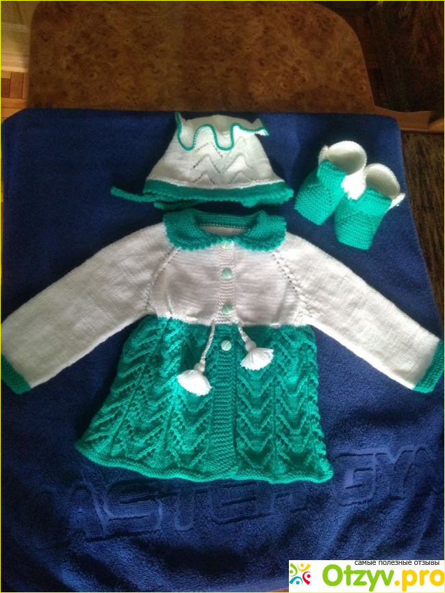 Шапочку, пинеточки и платье с полукомбинезоном на девочку 5 месяцев я связала из 4 моточков пряжи.