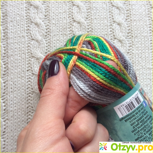 Пряжа очень интересного цвета, а точнее она состоит из разнообразных цветов, которые переходят друг в друга градиентом. В данном случае можно увидеть шесть оттенков серого, жёлтый, ярко зелёный как сосна, зелёный, красный оттенки. В переходе, именно в градиенте, различимы оранжевый и мутно – бордовый. Очень красивое сочетание оттенков, на первый взгляд шерсть кажется яркой и пёстрый, но в готовом изделии в е гармонично выглядит.