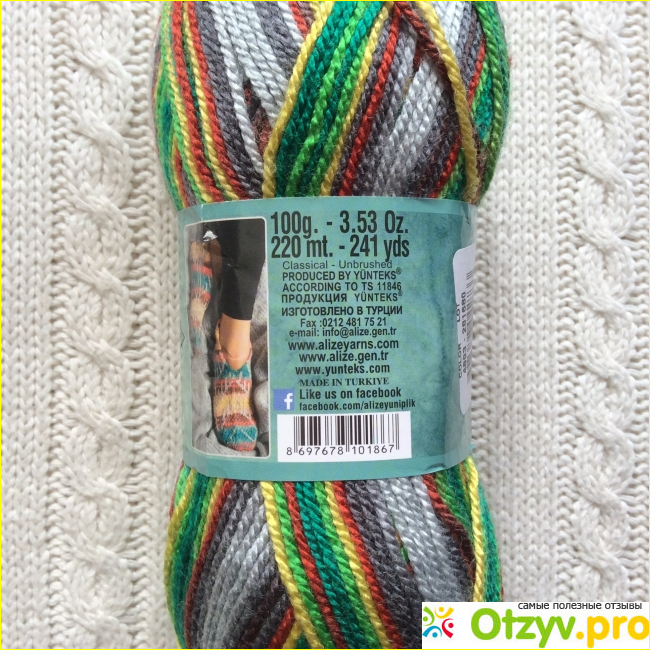Данная пряжа изготовлена в Турции, что мне очень нравится, так как я попробовала в работе пряжи разных производителей, и хочу сказать, что именно турецкое сырьё мне нравится больше всего. Вес такого мотка 100 г, содержит в себе 220 м нити.