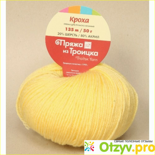 А увлеклась я вязанием с тех пор, как родился ребёнок. Мне захотелось связать для нее тепленький человечек-комбинезончик, который я нашла в интернете. Оригинальная вещь была связана из акрила приятного жёлтого цвета. Правда этот комбинезончик был с коротенькими рукавами и штанинками, а я решила связать тепленький, с длинными рукавами и штаниками. Мне непременно хотелось, чтобы цвет нитки был таким же, как в оригинальном изделии. Поэтому долго искала подходящий тон, жёлтых цветов много с их большим разнообразием оттенков, а вот именно такой вначале мне не попадался. Но все же мне повезло, я нашла этот тон среди палитры оттенков троицкой фабрики - пряжа Кроха. Пряжа на 80% состоит из акрила и на 20% из шерсти. Мне вначале хотелось связать вещь из шерсти, что бы пряжа была полностью натуральная, но где-то в интернете нашла упоминание о том, что малышами лучше вязать из акрила, потому что шерсть может казаться колючей для нежной кожи малышей, даже через одежду. Поэтому я смело приобрела себе несколько моточков, цвет как на фото.