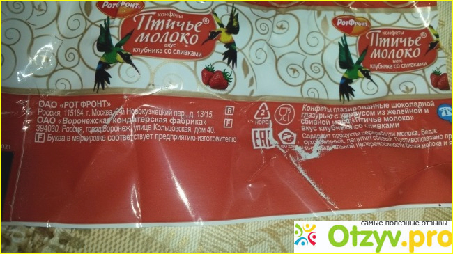 Упакованы они в красный фантик, на нем нарисована птичка и клубничка, вроде все в тему птичье молоко со вкусом клубники.