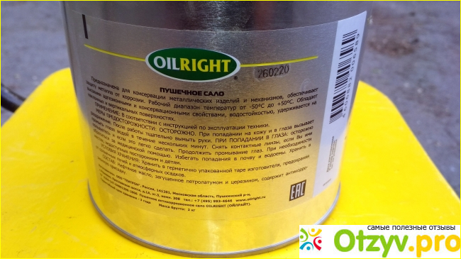 Пушечное сало "Ойлрайт" имеет в своем составе смолу, которая обладает высокой стойкостью к воздействию воды и агрессивных сред. Оно имеет густую консистенцию, благодаря чему легко ложится толстым слоем на металл и надежно защищает его от коррозии. Оно практически не вымывается водой и при правильном применении способно защитить металл на долгие годы.
