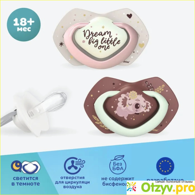 Дочка сразу взяла соску. В пустышке есть специальные отверстия для свободной циркуляции воздуха. Благодаря этому кожа на щёчках не потеет, и следов от пустышки не остаётся. Она плотно не прилегает к щёчкам и не давит. Слюнки у малышки не текут ручьём, потому что кончик пустышки правильной формы. Нагубник светится в темноте, без труда нахожу пустышку ночью в проватке.