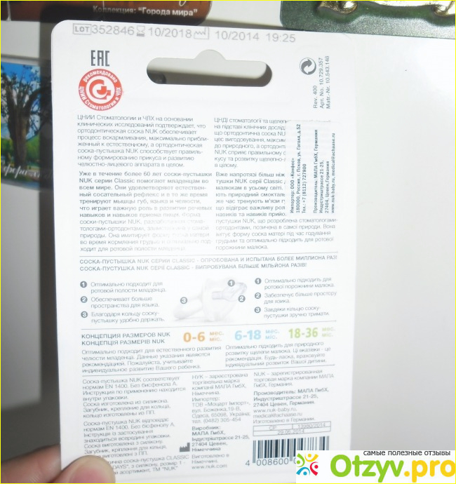На упаковке дана полная информация о товаре, кто его производитель, из чего состоит соска, как ее использовать.