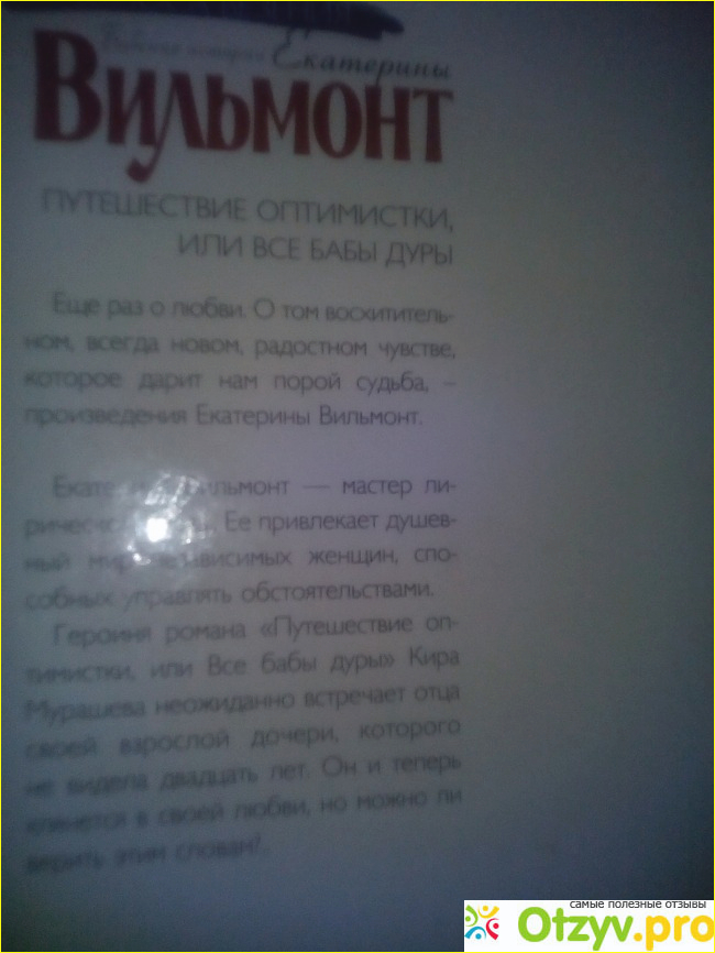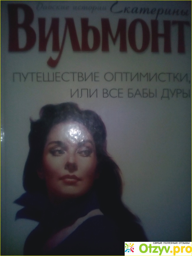 Многие её книги продаются в первой полосе со смешными названиями например:Фиг ли нам красивым женщинам . Или черте что и с боку бантик. Дам названия уже многообещающие . Так бы я и не читала не одной книжки Вильмонт если бы на свой день рождения от подруги не получила в подарок книку этой писательницы издательства Астрель. Её название Путешествие оптимистки или все бабы дуры. Ну и название подумала я но подруга сказала:почитай не пожалеешь. И что вы думаете я стала сразу её читать как бы не так. Положила на книжную полку очень надо мне читать. Но в один прекрасный день я решила хоть немножко вникнуть содержание книги. На обложке написано было Екатерина Вильмонт является мастером лирической прозы , она описывает мир независимых женщин. Пищит душевно о любви о восхитительном и нежном чувстве. В этот раз героиней её рассказа стала 47 летняя Кира Мурашова иллюстратор воспитывающая одна дочь которая в свой 18 вышла замуж и переехала в Израиль. О её любви к женатому человеку который давно расстался с ней и даже не знал что у него есть красавица дочка. Эта женщина бальзаковского возраста поедет к дочери в Израиль , познакомиться в самолёте с обоятельным вдовцом. Дальше с ним заведует курортный роман, получит предложение от него руки и сердца. И будет парить от любви когда вдруг на горизонте появится её давняя любовь и отец взрослой дочери, который будет просить прощения. И говорить что любит её. А какое решение примит Кира с кем ей быть можно узнать только в самом конце. Могу сказать читается роман легко здесь находится много места и юмору, и романтики. И даже загадочности эту книгу я прочитала на одном дыхании. Конечно она подходит для людей более старшего возраста но я в восторге от занятного Стива. Также мне понравились встречи главной героини с бывш