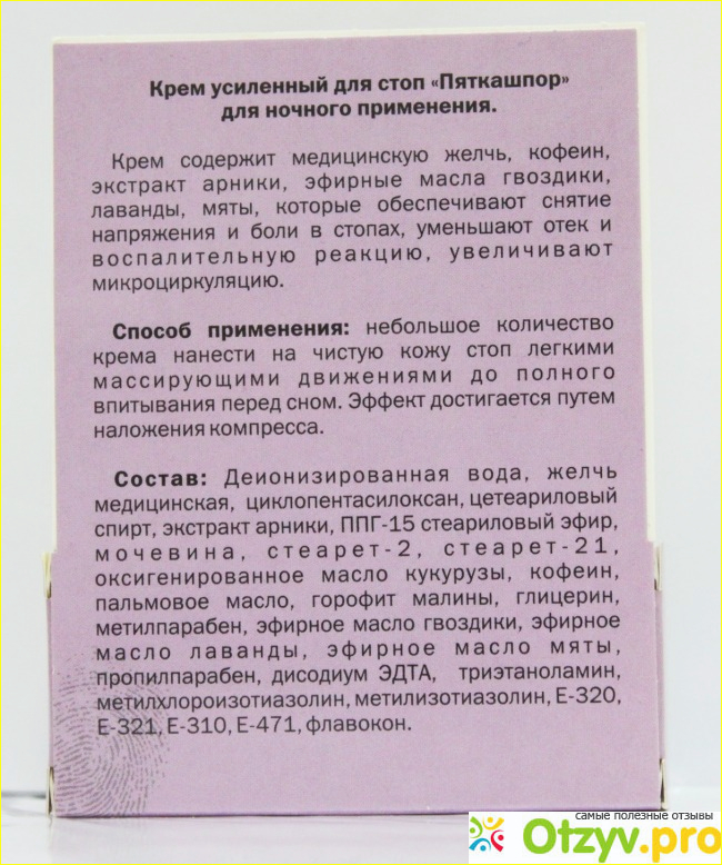 "Пяткашпор" содержит медицинские компоненты, работа которых нацелена на снятие напряжения в стопах, а также на защиту стопы от свободных радикалов. Среди них экстракт арники, кофеин, медицинская желчь, а также эфирные масла мяты, арники и лаванды. Именно эти масла отвечают за увеличение микроциркуляции, уменьшение отеков стопы и воспалительных реакций.