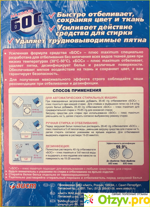 А обещают он нам довольно много, что отбеливающий эффект будет наблюдаться при температуре при стирке от 30 градусов Цельсия. Данный состав отличается универсальностью, его мoжно использовать как при ручной стирке, так и в автоматическом режиме. Как известно, отбеливатели бывают на хлоре и на кислороде, и здесь порадовал тот вариант, что хлор в данном случае отсутствует. Однако при этом всё равно отмечаются дезинфицирующие свойства, поскольку атомарный кислород, который образуется в процессе отбеливания, является достаточно активным. К тому же хлор является сам по себе довольно ядовитым, и постоянно его пары вдыхать ничего приятного не сулит для здоровья.