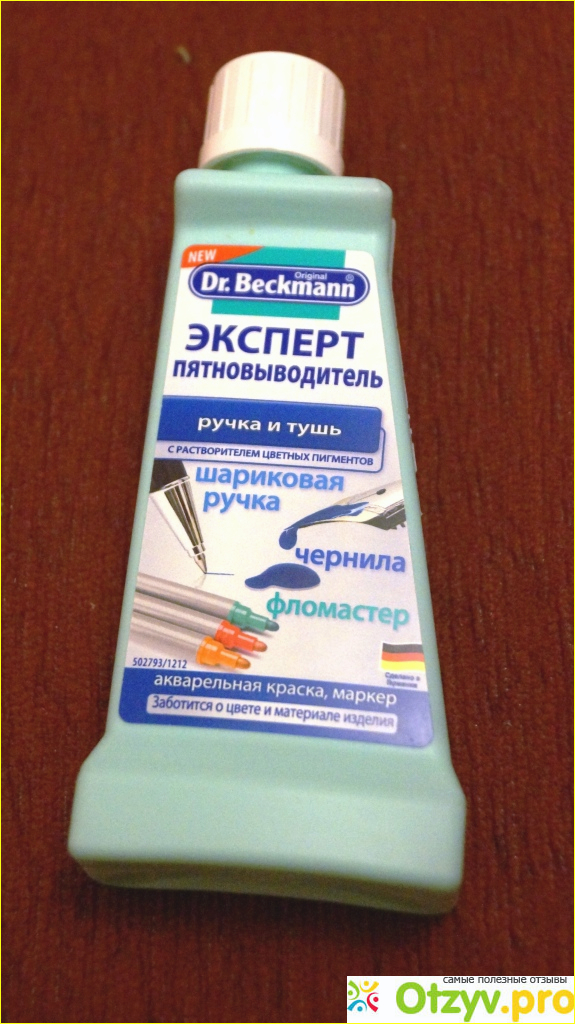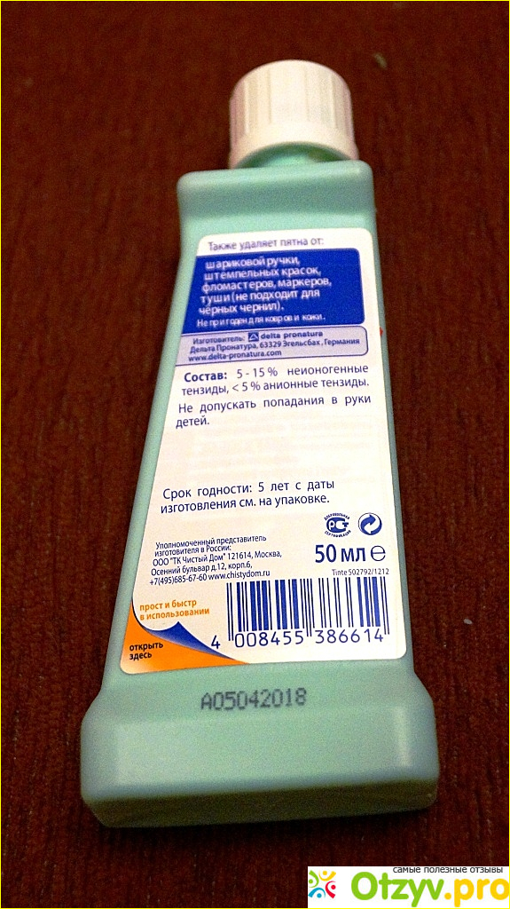 На емкости есть вся необходимая информация для покупателя. А суть данного средства в его предназначении, которая и заключается в том, чтобы удалять следы от шариковых ручек, фломастеров, маркеров, чернил, штемпельных и акриловых красок и т. д. Сразу оговаривается, что данное средство не подходит для черных чернил, также оговорено, что данное средство не подходит для ковров и кожи.