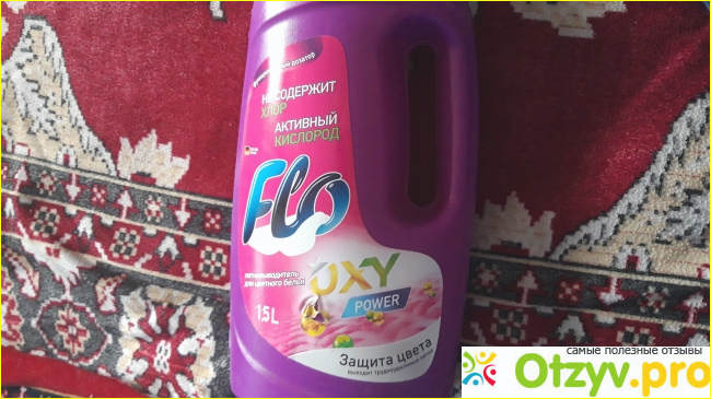 Кроме этого пятновыводителя, ранее не пользовалась продукцией "Flo". Привлекла большая упаковка по недорогой цене. Бутылка красочная, с мерным стаканчиком поверх крышки, удобная ручка.