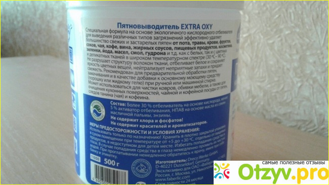 Производитель заявляет, что данным пятновыводителем можно не только отстирывать пятна на одежде разного происхождения, но и чистить ковры и даже посуду. Я им только стираю.