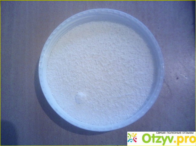 я решила сразу его опробовать. Тем более, что у меня был подходящий объект. Ужасно заляпаная фруктовым пюре футболка сына. Открыв крышку я увидела вот такой прошок