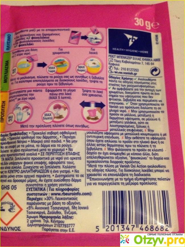 Вернувшись, супруг мне вручил маленький розовый пакетик и сказал, что развести его нужно на литр воды, а после замочить вещь на один час. Я сделала так как сообщили мне муж и инструкция применения, напечатанная на оборотной стороне средства. Когда через час я посмотрела на новую блузку, винного пятна не нй уже не было видно.