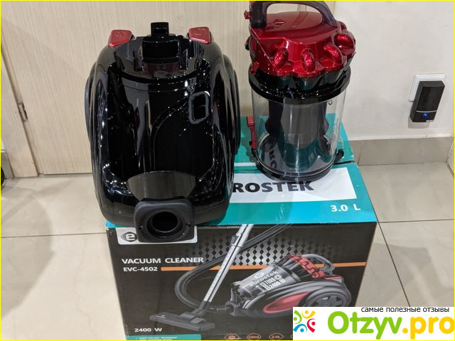 После того, как нам доставили технику домой, мы сразу же принялись ее распаковывать. Очень интересная коробка, а внутри не менее интересный пылесос, внешний вид которого просто завораживает. Сразу отчетливо видать пылесборник, который выступает в виде циклонного фильтра и тут сразу же большой плюс - это его объем на 3 литра. Таким образом нам не надо после каждый уборки освобождать контейнер от пыли и грязи, хватает минимум на три захода. Предусмотрена в модели также защита от перегрева, но в среднем на уборку комнаты у нас уходит примерно минут 10-15, в остальном супруга тряпками убирает кухню, ванную, туалет, прихожую и балкон. Конструкцией пылесоса Eurostek EVC-4502 предусмотрен HEPA-фильтр, который также периодически необходимо промывать, а в случае, когда пылесос начинает перегреваться при условии, что пылесборник не полный и все фильтра чистые, в таком случае необходимо полностью заменить HEPA фильтр на новый.