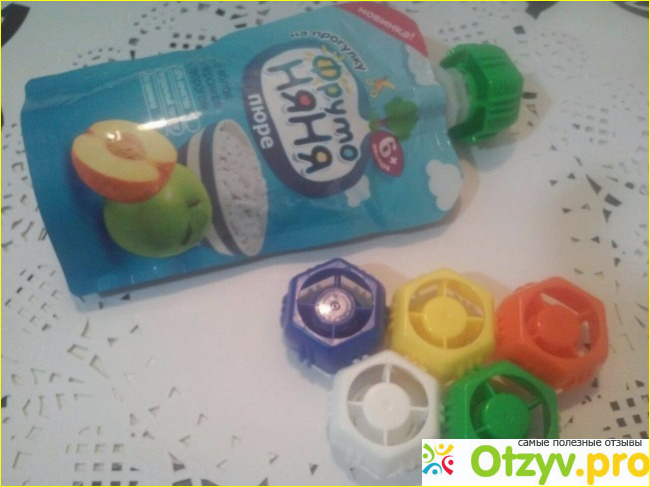 Крышка пюре довольно большая и не имеет заостренных выступов, поэтому можно не бояться, что малыш её проглотит или может ей пораниться.