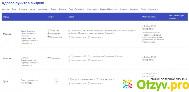 Данный интернет-магазина сделан довольно удобно. Помимо этого, у компании имеются свои пункты выдачи, которые также располагаются во многих крупных городах европейской части нашей страны. У этой компании помимо естественно Москвы есть пункты выдачи в таких городах, как Тула, Воронеж, Курск, Краснодар, Тверь, Липецк, Санкт-Петербург, Нижний Новгород, Самара, Иваново, Орёл и Смоленск. С полным списком адресов пунктов выдачи по городам можно ознакомиться в отдельном разделе на сайте. Там можно узнать о филиалах компании, которые находятся также во многих городах. Сам сайт очень дружественен к покупателям и постоянно пытается подсказывать и вести клиента от выбора покупки до её приобретения. Круглосуточно можно обратиться к менеджерам интернет-магазина за разъяснением тех или иных вопросов, а также написать руководству.
