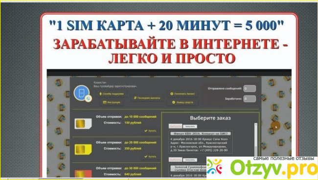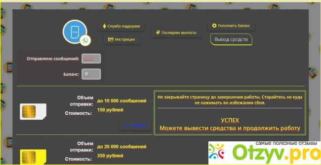 Перейдя на страницу рассылки сообщений, предлагают пополнить баланс и приобрести пакеты. Я купила пакет за 150 рублей, который отправит 10 000 смс и даст мне заработок равный 7 000 рублей, так как в инструкции указана что стоимость одного отправленного сообщения равна 70 копейкам.Приобретая пакет с смс он становится активен, включается датчик рассылки, где указывается количество отправляемых сообщений. Но не все так просто как было показано в видео. Внезапно датчик смс останавливается, на экране возникает сообщение, что можно вывести средства и продолжить работу, так как 10 000 смс до конца не отправлены. Перейдя по ссылке "вывод денег" здесь снова предлагают оплатить, но только уже называется это "комиссия для вывода средств" и цена ее 189 рублей. И тут конечно становится все ясно, что это полный развод, и ничего ты не получишь. Скорее всего после отправки 10000 сообщений и троекратного пополнения чужого кошелька, на следующий день этот сайт будет просто недоступен.
