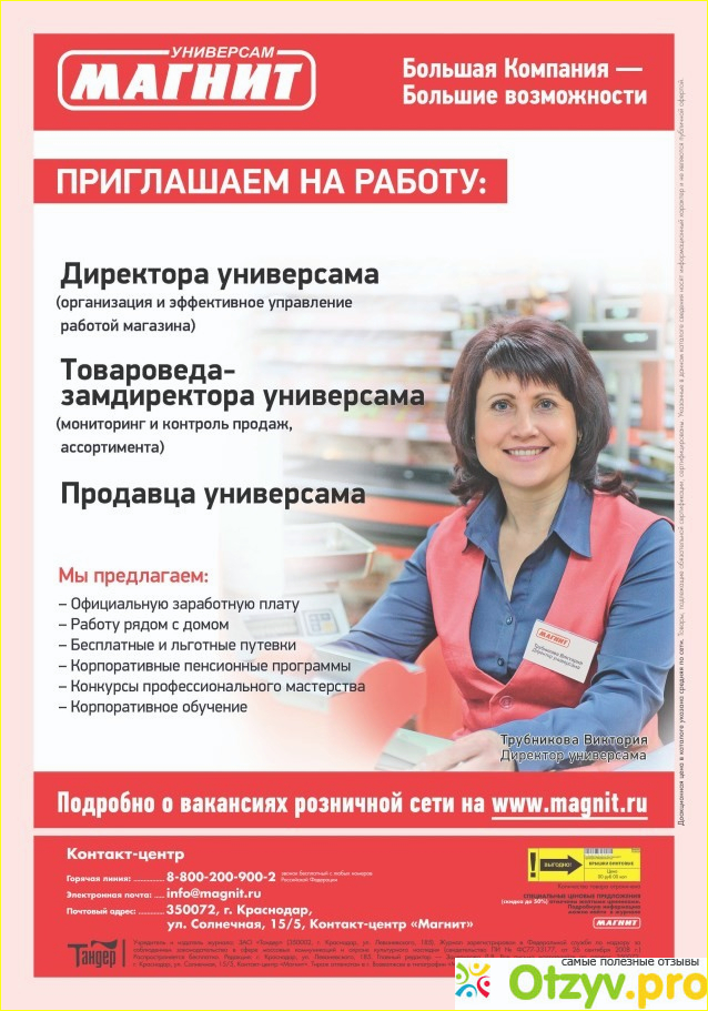 Если бы не нормальная зарплата и аккуратные сроки выплаты - я бы задумалась рекомендовать ли такую трудную работу. Но так, как сеть Магнит платит исправно своим сотрудникам, я скажу - работать в Магнит хоть и трудно, но вполне можно. Я проработала там около 2 лет.