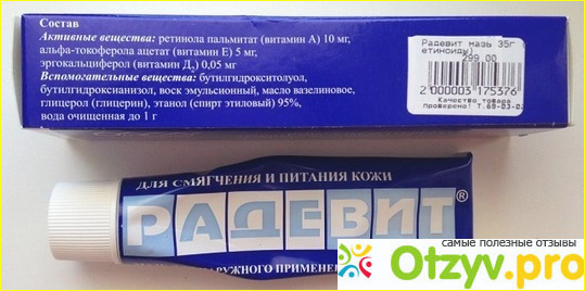 Радевит успешно применяется в медицине против множества кожных проблем, различных дерматозов, ожегов, трещин, ороговевших участков кожи. Кроме того, имеет достаточно хороший состав, ведь в нём присутствуют витамины А, Д и Е, также в средстве Радевит не содержится никаких отдушек и красителей, а также сильной химии которая способно навредить коже. Именно безобидный состав привлёк внимание женщин, которые решили с помощью данного средства избавиться от морщин, и к их удивлению это получилось достаточно хорошо, а так же быстрр.