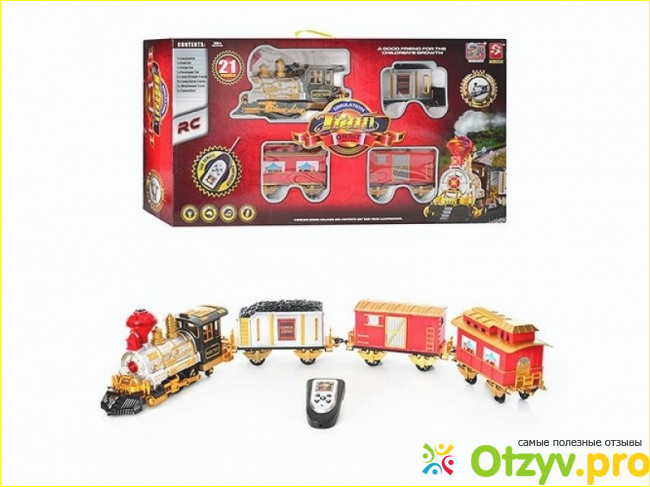 Сама игрушка состоит из радиоуправляемого паровозика на рельсах, а так же железнодорожной станции. У паровозика присутствует звуковое сопровождение и свечение, а так же эффект дыма из трубы. В комплектацию так же входит пульт управления и батарейки. Игрушка предназначается для детей от 3 лет, упаковка в коробке в коробке, 80-43-15см. Рекомендую на подарок всем детям, чьи родители так же как и мы являются тружениками стальных магистралей! ваш ребенок будет очень доволен, да и сами родители получат массу удовольствия!