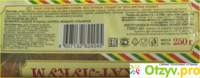 В составе ничего страшного не обнаружено, красители и ароматизаторы - натуральные. Здесь же указана пищевая ценность и калорийность в расчете на 100 грамм продукта. Вес же самого продукта 250 грамм. Срок хранения Рахат-Лукума достаточно большой - 8 месяцев, но столько, вы уж поверьте, он на прилавках не залеживается.