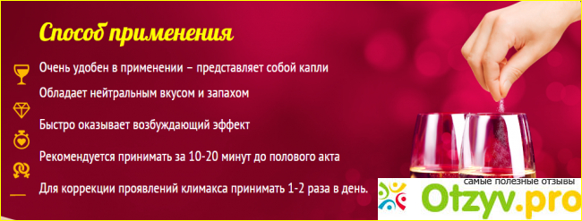 Алексей. Попробовал инструмент на жене. С ним ознакомились по инструкции, и не нашли ничего вредного, побочные эффекты не были выражены, а у жены вроде бы не было аллергии, что может быть и хорошо. Капнув его прямо в бокал шампанского, через пятнадцать минут поняла, что это сработало. Это уникально и ново для нас, я никогда не видел такой любви от моей жены. Теперь мы используем его на постоянной основе. Как часть только естественных ингредиентов, что наркомания быть испуганным. Формат очень легкий, горлышко бутылки имеет специальный ограничитель, который позволяет добавлять три дозированные непосредственно в стакан. Запах, пахнет лимоном или апельсином, то есть принцип, чтобы запах не привлекал внимания.