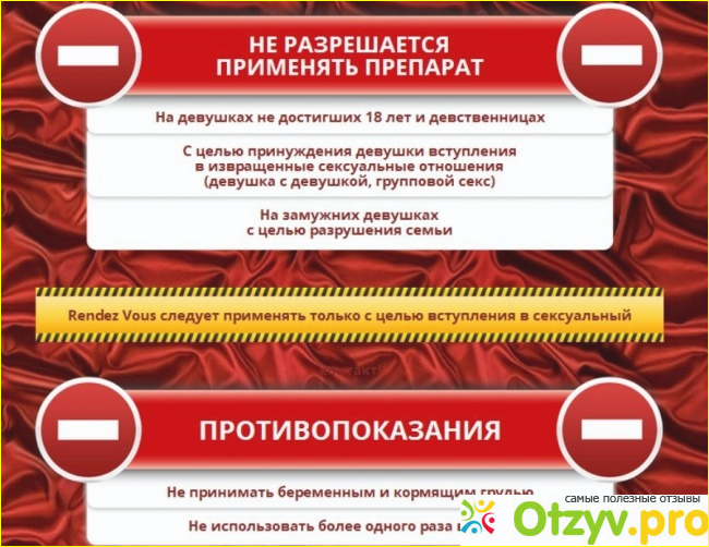 Возбудитель RENDEZ VOUS считается безопасным средством, так как не оказывает серьезной нагрузки на внутренние органы. И все же препарат показан не всем. С особой осторожностью следует принимать, а то и вовсе отказаться от стимуляции, женщинам перенесшим операцию на сердце, инсульт или инфаркт. Также Рандеву противопоказан беременным и кормящим. К противопоказаниям относится индивидуальная непереносимость ингредиентов, послеоперационный период, аритмия. Сексопатологи рекомендуют обращаться к препарату, когда общее состояние стабильно и организму не требуется длительное восстановление.