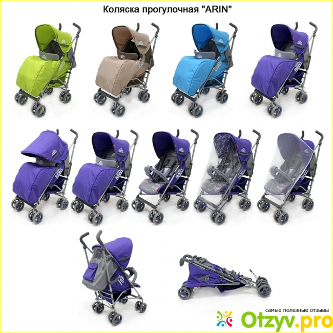 Дополнительные удобства: москитная сетка, дождевик, накидка на ножки, съемный бампер, корзина для покупок, ламинированная регулируемая подножка.