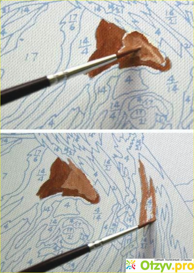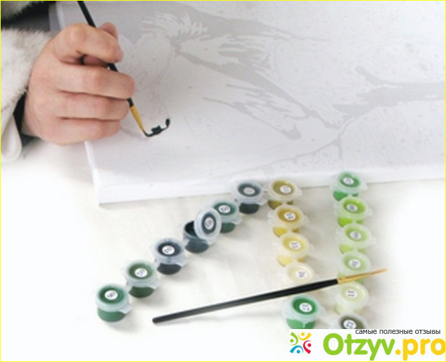 На холсте нанесены контуры определенных номеров красок, которым соответствуют баночки с красками. Все номера хорошо видно, плюс у вас есть подсказка в виде фотографии готовой работы.