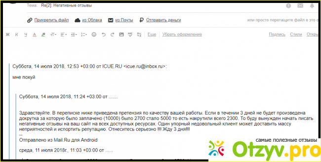 Заказал раскрутку аккаунта инстаграмм, взяли предоплату, работу не выполнили. Никому не советую связываться с сайтом icue.ru, не выполняют взятые на себя обязательства, когда задаешь вопрос на почту посылают... Скрин переписки во вложении.