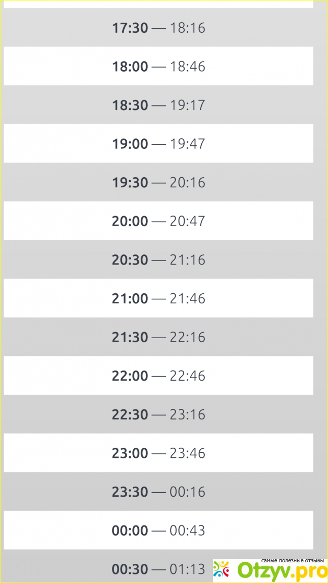 3.00, 6.00, 6.30, 7.00, 730. 8.00, 8.30, 9.00, 9.30, 10,00, 10.30, 11.00, 11.30, 12.00, 13.00, 13.30, 14.00, 14.30. 15.00, 15.30,16.00, 16.30, 117.00. 17.30, 18.00. 18.30, 19.00. 19.30,20.00, 20.30,21.00.21.30.22.00,22.30,23.00.23.30,00.00, 00.30