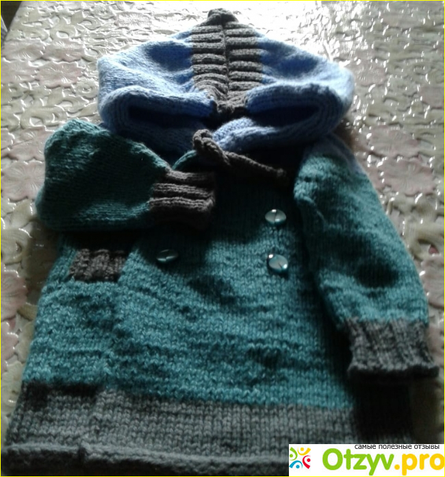 Потом придумала связать небольшой карманчик. Далее связала просто длину какую придумала. Закончила вязание полым шнуром. На рукавах сделала уменьшение петель через определенные промежутки рядов. Закончила резинкой 2х2. Затем на горловине распустила нитки, и начала вязать капюшон. Разделила количество петель на две равные части. Вправо и влево по одной петле стала через два рядочка с одной и другой стороны прибавлять по одной петле. И так три раза. Затем так же прибавлять, но через четыре ряда.