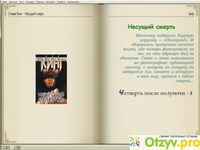 Первые две главы (или 60 электронных страниц из 284) немного затянуты. Мальчик получает фотоаппарат, видит, что изображение на карточке не то что должно быть и пытается разобраться. Много размышлений, вариантов, описаний процесса фотографии и старых камер. Но читать интересно. Именно из-за описаний разных фото-штучек. Но не всем такое интересно. Хотя, можно сказать, рвёшь землю как конь, желая узнать, что дальше. И текст кажется немного затянутым.