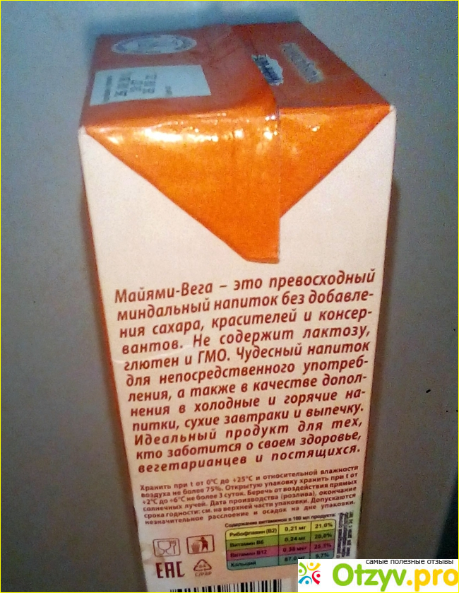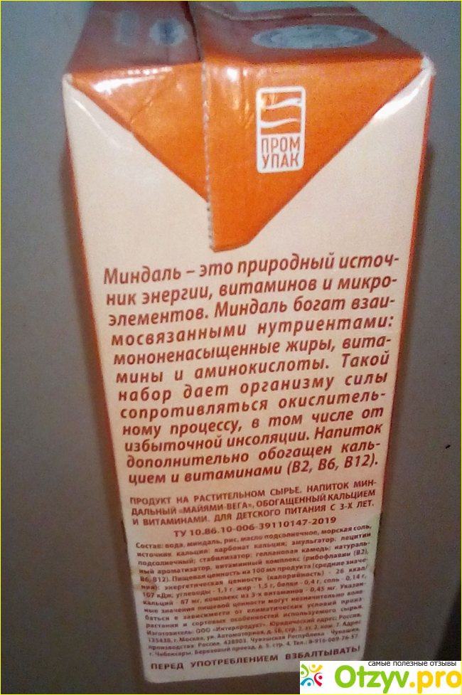 Также на коробке расписаны полезные свойства миндаля. Изготовлен напиток по ТУ. Перед употреблением необходимо взбалтывать. Расписан состав. На первом месте в составе, разумеется, вода. На втором миндаль. Потом идут рис и морская соль.