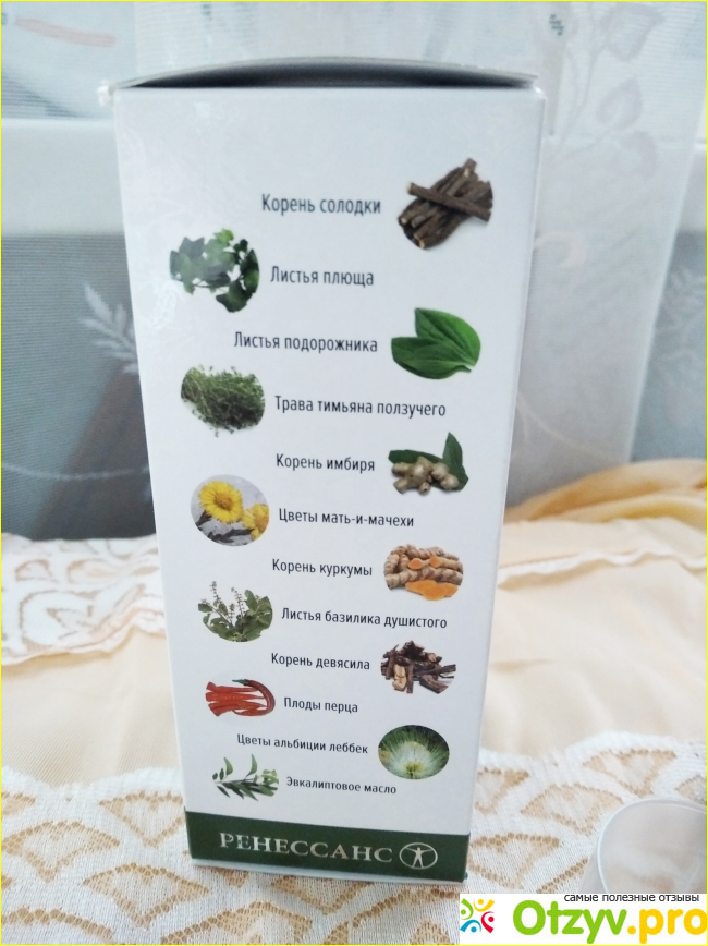 Состав весь растительный, для меня как для поклонницы ЗОЖ это важно. Мать-и-мачеха, базилик, куркума, имбирь, эвкалиптовое масло. Всё это уже в виде сиропа, естественно, на вкус весьма приятного.