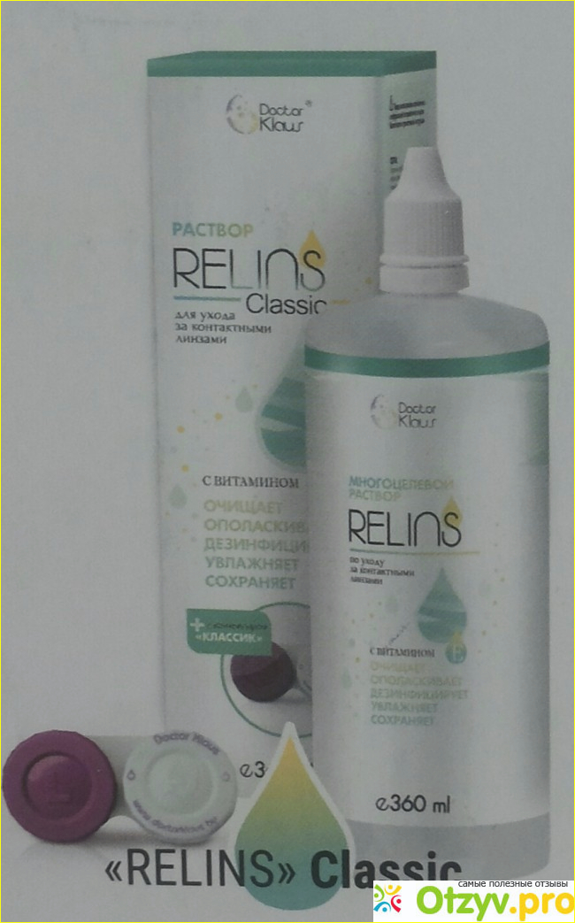 к. езжу за рулем. Спасибо человечеству за прогресс и некогда придуманные линзы. Сейчас это мой выход из положения. Зрение упало не так давно, в последний год стало невозможно ездить без линз. Очень повезло с офтальмологом, ходила в частный медицинский центр. Пожалуй, обойдемся без имен и названий, чтобы не сочли за рекламу. Так вот, сразу попали с линзами и раствором, все, чем сейчас пользуюсь, это с подачи специалиста. Мне не пришлось заниматься самолечением и набитыми шишкам с выбором. Линзы и раствор подошли друг другу и моим глазам. Сегодня о растворе, поэтому немного подробнее расскажу. Раствор называется RELINS производитель «ДОКТОР КЛАУС». Совместный продукт Германии и наш (РБ). Считается универсальным из-за состава: подходит для аллергиков и под любые линзы. При необходимости можно использовать в качестве увлажняющих капель. Я всегда беру объем 360 мл, можно с/без контейнера. Я беру с. Контейнеры прочные, не пропускают влагу. Флакон прозрачный, отслеживается содержимое. Дозатор-капельница, так что не переливается сверх надобности. Основные компоненты состава витамин Е и гиалоурановая кислота. Для полной дезинфекции не обязательно выжидать всю ночь/день, линзы чистые после 3-4 часов нахождения в растворе. Поверхность чистая, без разводов, без «отложений» от прошлой носки. Раствор линзы не истончает и не деформирует. Перейду к основному плюсу раствора - это увлажнение. Ощущения невесомости на глазах мне хватает на весь день. Докапывать не требуется. Увлажняет прям очень хорошо. Запах нейтральный. Последний раз покупка обошлась в 18 белорусских рублей.