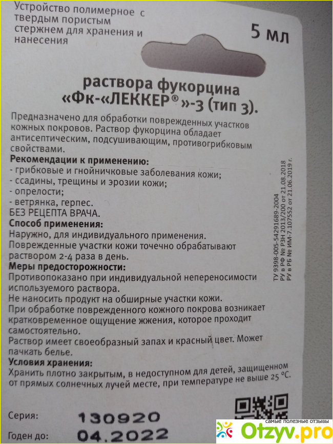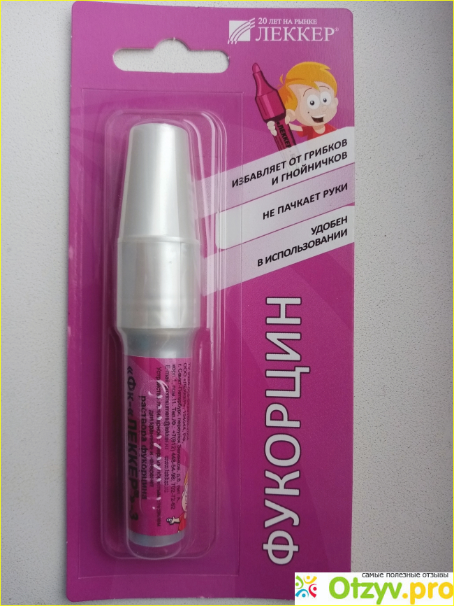 Итак, это антисептическое и противогрибковое средство. Также в рекомендациях - наличие ссадин, трещин, опрелостей и эрозий. Яркого цвета, розово-фиолетового оттенка. Приобрела за сто тридцать семь рублей. Фактически раствор фукорцина можно купить в несколько раз дешевле, при том что объём бутылочки будет больше (около двадцати пяти мл). В полимерном устройстве приобретённом в свою очередь всего пять мл. В связи с этим, основной недостаток - его стоимость.