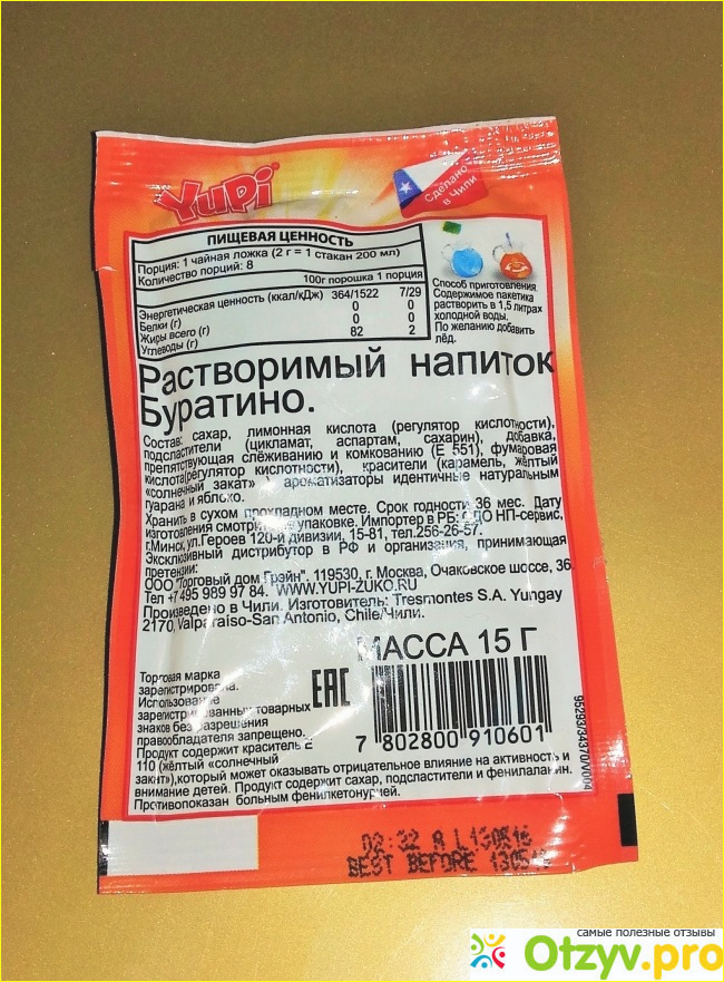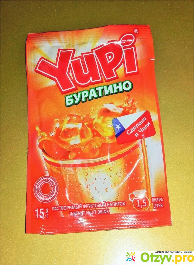 Сегодня у меня Буратино. Вес порошка составляет пятнадцать граммов. Растворять необходимо в полтора литрах воды. Употреблять желательно в охлажденном варианте. Концентрат оценивается за пятнадцать рублей. Единственное преимущество в стоимости и качестве.