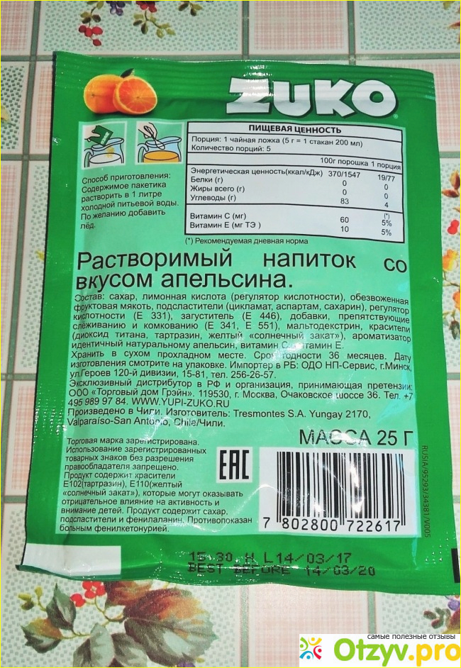 Ну, у данной компании кроме Zuko существует еще и Yupi, а оно лучше подходит для приготовления подобных лимонадов. В данных пакетиках содержится пектин, и данный химикат является отличным имитатором мякоти. Поэтому будьте бдительны: мякоть не всегда бывает фруктовым жмыхом. Реально не отличите от настоящего.
