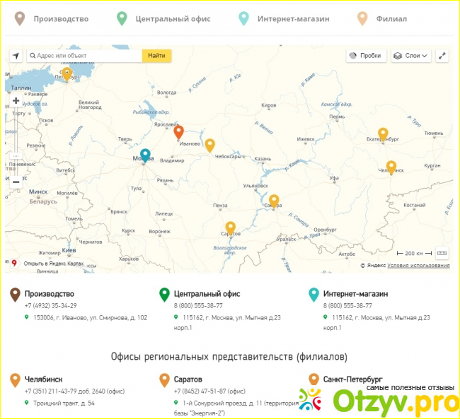 В этом разделе размещены адреса и телефоны офисов региональных представительств и схема, на которой в интерактивном режиме можно найти Центральный офис, Интернет-магазины, Филиалы и, конечно, производство.