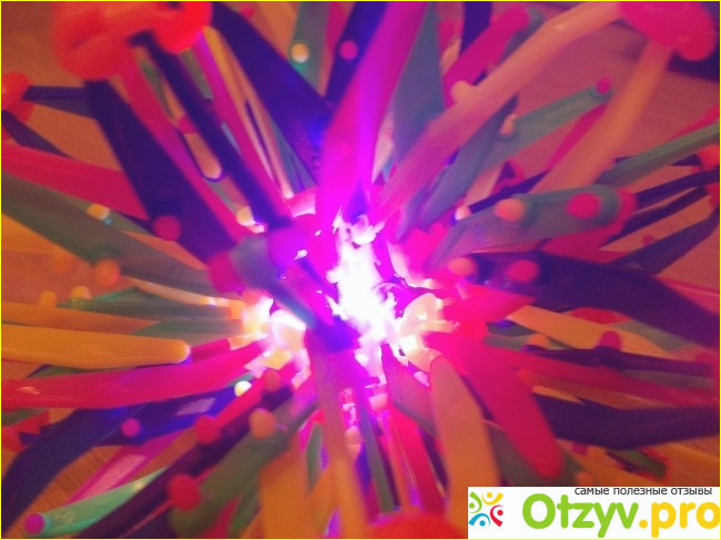 У нас два таких шарика. Один самый обычный, а второй- с светящимися фонариками. Фонарики загораются от удара об пол и светятся некоторое время.